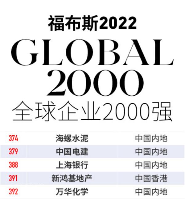 據福布斯5月12日最新發布的2022全球企業2000強榜單,海螺水泥再次上榜,位列374位。