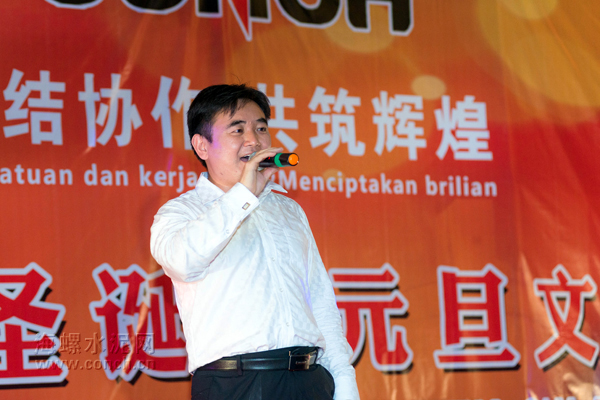 “你到我身邊,帶著微笑,流金的歲月,把你從遠(yuǎn)方帶到我的身旁”PT.SULENCO BOHUSAMI CEMENT公司董事長(zhǎng)卓瑞瑞的一首《遲到》,在公司總經(jīng)理曾國華的即興伴舞下,把晚會(huì)氣氛推向一個(gè)新的高潮,掌聲、歡呼聲、吶喊聲,聲聲不絕,渲染了晚會(huì)歡樂的氣氛。