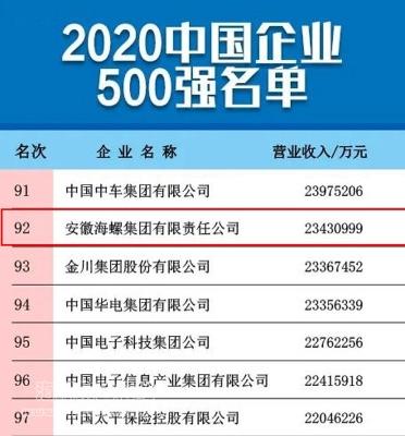 海螺集團連續(xù)16年入圍中國企業(yè)500強,榮列2020中國企業(yè)500強第92位,較2019年上升了13位,首次邁進前100強,也終結(jié)了安徽省多年無企業(yè)進入前100位的歷史;同時,榮列2020中國制造業(yè)企業(yè)500強第30位,比2019年上升8位;榮列2020中國跨國公司100大第96位,比2019年上升2位。