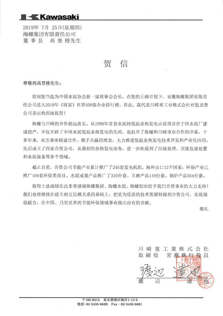 川崎重工致高登榜董事長賀信